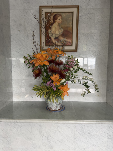 今月は、鮮やかなオレンジのユリを中心に、華やかさと温かみのある素敵な作品となりました✨玄関正面に飾っておりますので、ご来所の際はぜひ足を止めてご覧ください😊
